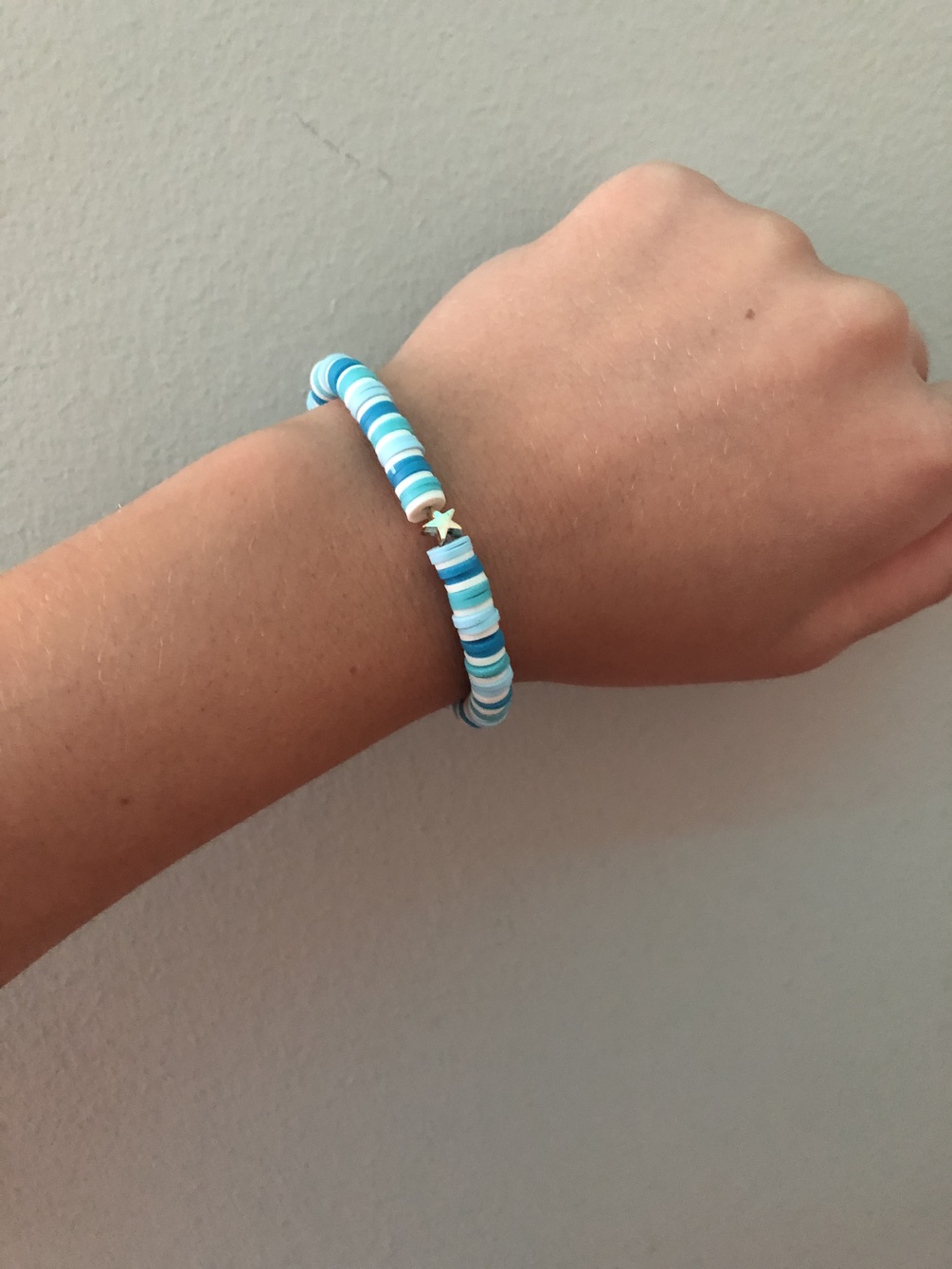 A patterned bracelet with white and a variety of blues. Also includes a golden star charm.